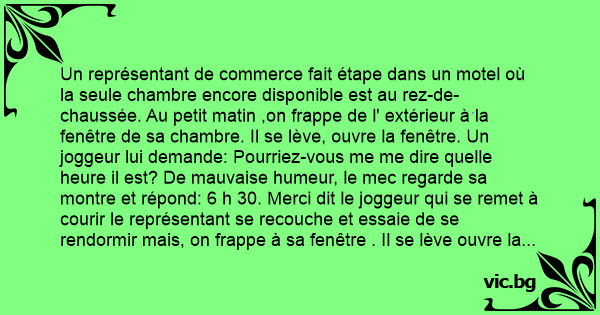 Un représentant de commerce fait étape dans un motel où la seule chambre encore disponible est au rez-de-chaussée. Au petit matin ,on frappe de l' extérieur à la fenêtre de sa chambre. Il se lève, ouvre la fenêtre. Un joggeur lui demande: Pourriez-vous me me dire quelle heure il est? De mauvaise humeur, le mec regarde sa montre et répond: 6 h 30. Merci dit le joggeur qui se remet à courir le représentant se recouche et essaie de se rendormir mais, on frappe à sa fenêtre . Il se lève ouvre la fenêtres . C'est un joggeur qui lui demande l heure.