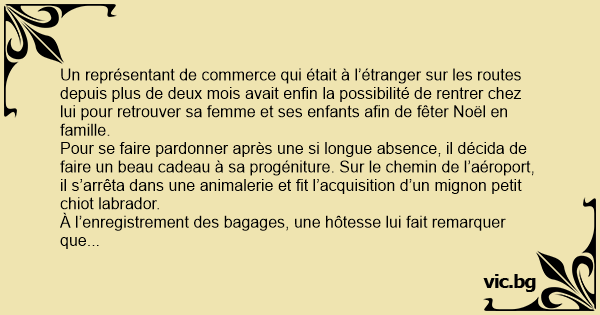 - Eh bien, lui répond le VRP d’un ton visiblement embêté, vous savez, le chiot que je vous ai montré à l’embarquement et au sujet duquel vous m’aviez dit qu’il devait voyager en soute… En fait, je ne m’en suis pas séparé, mais je l’ai emmené avec moi ici, en cabine, en le cachant dans mon caleçon.
