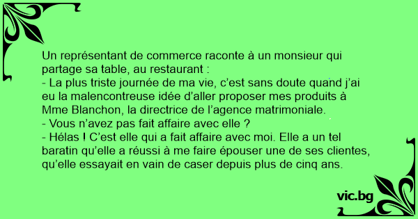 - Hélas ! C’est elle qui a fait affaire avec moi. Elle a un tel baratin qu’elle a réussi à me faire épouser une de ses clientes, qu’elle essayait en vain de caser depuis plus de cinq ans.