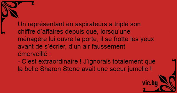 Un représentant en aspirateurs a triplé son chiffre d’affaires depuis que, lorsqu’une ménagère lui ouvre la porte, il se frotte les yeux avant de s’écrier, d’un air faussement émerveillé :