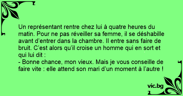 Un représentant rentre chez lui à quatre heures du matin. Pour ne pas réveiller sa femme, il se déshabille avant d’entrer dans la chambre. Il entre sans faire de bruit. C’est alors qu’il croise un homme qui en sort et qui lui dit :