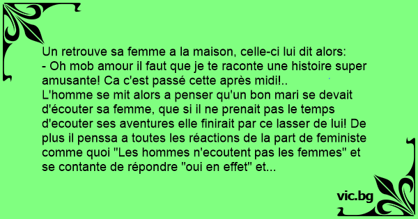 L'homme se mit alors a penser qu'un bon mari se devait d'écouter sa femme, que si il ne prenait pas le temps d'ecouter ses aventures elle finirait par ce lasser de lui! De plus il penssa a toutes les réactions de la part de feministe comme quoi "Les hommes n'ecoutent pas les femmes" et se contante de répondre "oui en effet" et qu'il ne devait pas engrainer ce clicher! C'est décider se dit il! A partir d'aujourd'hui il ne ratera plus une parole de ma blonde!