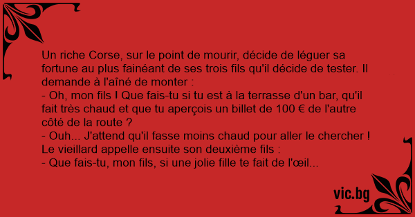 Un riche Corse, sur le point de mourir, décide de léguer sa fortune au plus fainéant de ses trois fils qu'il décide de tester. Il demande à l'aîné de monter :