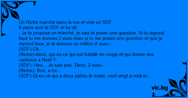 - Je te propose un marché, je vais te poser une question. Si tu repond faux tu me donnes 2 euro mais si tu me poses une question et que je répond faux, je te donnes un million d' euro.-