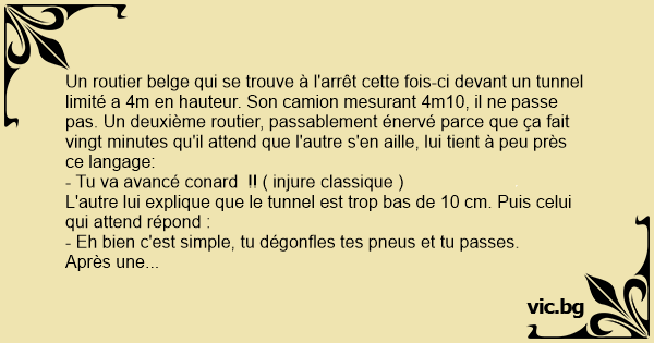 Un routier belge qui se trouve à l'arrêt cette fois-ci devant un tunnel limité a 4m en hauteur. Son camion mesurant 4m10, il ne passe pas. Un deuxième routier, passablement énervé parce que ça fait vingt minutes qu'il attend que l'autre s'en aille, lui tient à peu près ce langage: