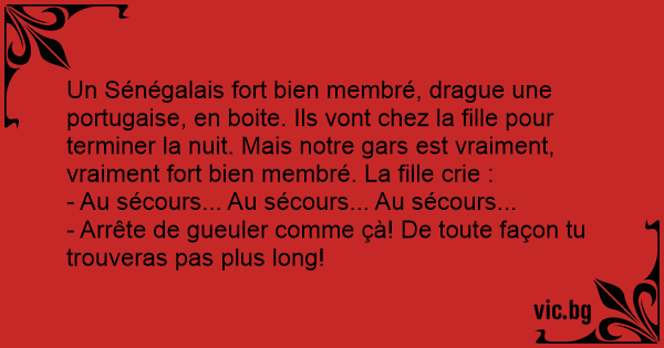 Un Sénégalais fort bien membré, drague une portugaise, en boite. Ils vont chez la fille pour terminer la nuit. Mais notre gars est vraiment, vraiment fort bien membré. La fille crie :