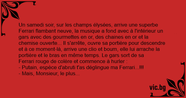 Un samedi soir, sur les champs élysées, arrive une superbe Ferrari flambant neuve, la musique a fond avec à l'intérieur un gars avec des gourmettes en or, des chaines en or et la chemise ouverte... Il s'arrête, ouvre sa portière pour descendre et à ce moment-là, arrive une clio et boum, elle lui arrache la portière et le bras en même temps. Le gars sort de sa Ferrari rouge de colère et commence à hurler :