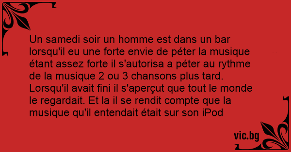 Un samedi soir un homme est dans un bar lorsqu'il eu une forte envie de péter la musique étant assez forte il s'autorisa a péter au rythme de la musique 2 ou 3 chansons plus таrd.