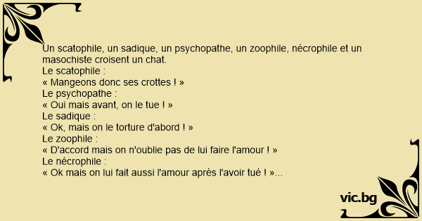 Un zoophile, un pédophile, un nécrophile et un sadomaso s'ennuient. Le zoophile : - je baiserai bien un chat. Le pédophile : - Un chaton alors ! Le nécrophile : - Un chaton mort.. Le SM : - Miaou ?