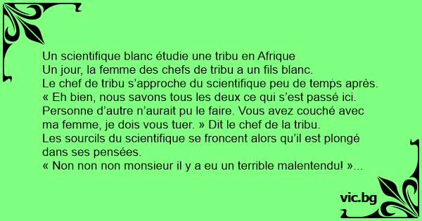 Dans le village centre-africain naît un bébé blanc. Le papa vexé se pose des questions et trouve une réponse alors il va voir le missionnaire, seul blanc dans la tribu. Le missionnaire lui explique...