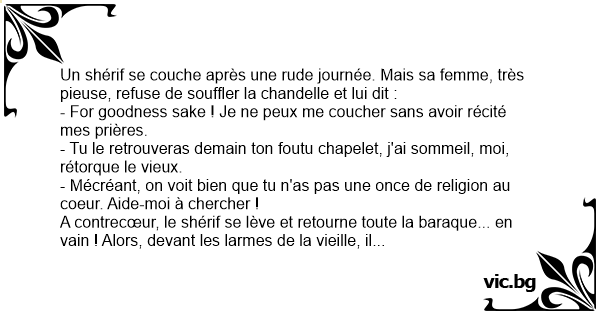 Un shérif se couche après une rude journée. Mais sa femme, très pieuse, refuse de souffler la chandelle et lui dit :