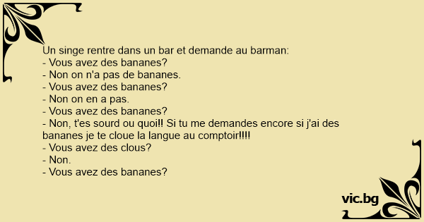 - Non, t'es sourd ou quoi!! Si tu me demandes encore si j'ai des bananes je te cloue la langue au comptoir!!!!