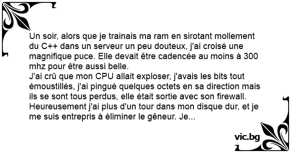 Un soir, alors que je trainais ma ram en sirotant mollement du C++ dans un serveur un peu douteux, j'ai croisé une magnifique puce. Elle devait être cadencée au moins à 300 mhz pour être aussi belle.
