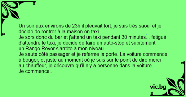 Je sors donc du bar et j'attend un taxi pendant 30 minutes... fatigué d'attendre le taxi, je décide de faire un auto-stop et subitement un Range Rover s'arrête à mon niveau.