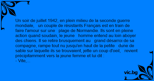 Un soir de juillet 1942, en plein milieu de la seconde guerre mondiale, un couple de résistants Français est en train de faire l'amour sur une plage de Normandie. Ils sont en pleine action quand soudain, le jeune homme entend au lоin aboyer des chiens. Il se retire brusquement au grand désarroi de sa compagne, rampe tout nu jusqu'en haut de la petite dune de sable sur laquelle ils se trouvaient, jette un coup d'oeil, revient précipitamment vers la jeune femme et lui dit :