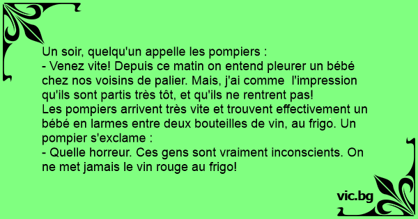 Les pompiers arrivent très vite et trouvent effectivement un bébé en larmes entre deux bouteilles de vin, au frigo. Un pompier s'exclame :