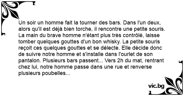 Un soir un homme fait la tourner des bars. Dans l'un deux, alors qu'il est déjà bien torche, il rencontre une petite souris. La main du brave homme n'étant plus très contrôlé, laisse tomber quelques gouttes d'un bon whisky. La petite souris reçoit ces quelques gouttes et se délecte. Elle décide donc de suivre notre homme et s'installe dans l'ourlet de son pantalon. Plusieurs bars passent... Vers 2h du mat, rentrant chez lui, notre homme passe dans une rue et renverse plusieurs poubelles faisant un bruit d'enfer. Une personne se penche alors a l'une des fenêtres d'un immeuble proche et lui dit :
