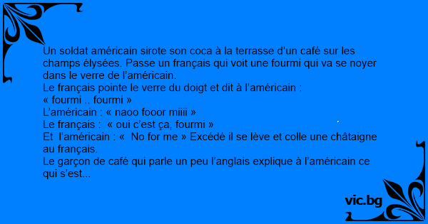 Un soldat américain sirote son coca à la terrasse d’un café sur les champs élysées. Passe un français qui voit une fourmi qui va se noyer dans le verre de l’américain.