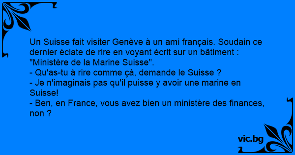 Un Suisse fait visiter Genève à un ami français. Soudain ce dernier éclate de rire en voyant écrit sur un bâtiment :