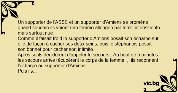 Un supporter de l'ASSE et un supporter d'Amiens se promène quand soudain ils voient une femme allongée par terre inconsciente mais surtout nue .