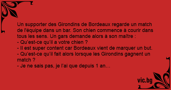 Un supporter des Girondins de Bordeaux regarde un match de l'équipe dans un bar. Son chien commence à courir dans tous les sens. Un gars demande alors à son maître :