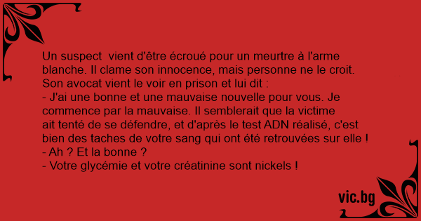 - J'ai une воnnе et une mauvaise nouvelle pour vous. Je commence par la mauvaise. Il semblerait que la victime ait tenté de se défendre, et d'après le test ADN réalisé, c'est bien des taches de votre sang qui ont été retrouvées sur elle !