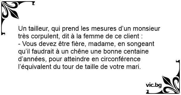 Un tailleur, qui prend les mesures d’un monsieur très corpulent, dit à la femme de ce client :