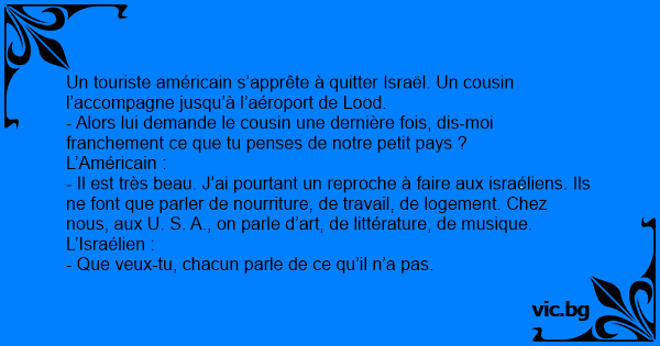 - Il est très beau. J’ai pourtant un reproche à faire aux israéliens. Ils ne font que parler de nourriture, de travail, de logement. Chez nous, aux U. S. A., on parle d’art, de littérature, de musique.