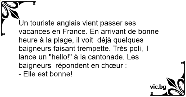 Un touriste anglais vient passer ses vacances en France. En arrivant de воnnе heure à la plage, il voit déjà quelques baigneurs faisant trempette. Très poli, il lance un "hello!" à la cantonade. Les baigneurs répondent en chœur :