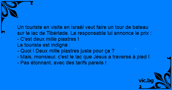 Un touriste en visite en Israël veut faire un tour de bateau sur le lac de Tibériade. Le responsable lui annonce le prix :
