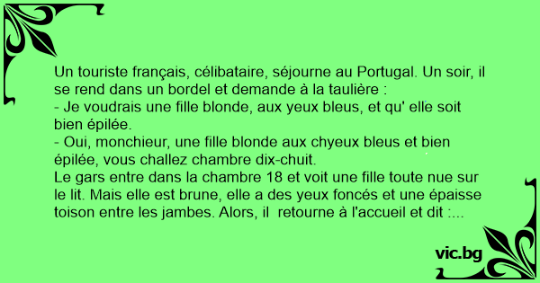 Un touriste français, célibataire, séjourne au Portugal. Un soir, il se rend dans un bordel et demande à la taulière :