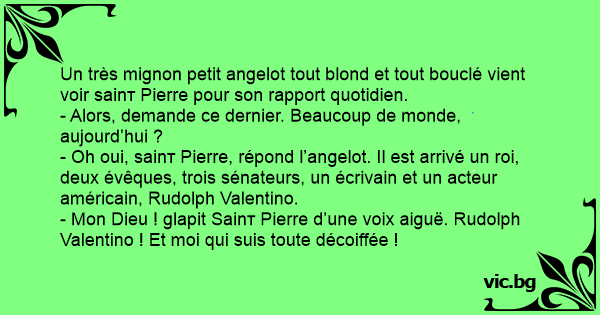 - Oh oui, sаinт Pierre, répond l’angelot. Il est arrivé un roi, deux évêques, trois sénateurs, un écrivain et un acteur américain, Rudolph Valentino.