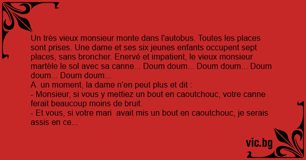 Un très vieux monsieur monte dans l'autobus. Toutes les places sont prises. Une dame et ses six jeunes enfants occupent sept places, sans broncher. Enervé et impatient, le vieux monsieur martèle le sol avec sa canne... Doum doum... Doum doum... Doum doum... Doum doum...