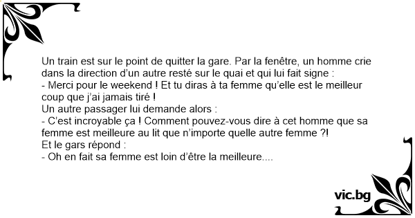 - Merci pour le weekend ! Et tu diras à ta femme qu’elle est le meilleur coup que j’ai jamais tiré !