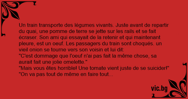 Un train transporte des légumes vivants. Juste avant de repartir du quai, une pomme de terre se jette sur les rails et se fait écraser. Son ami qui essayait de la retenir et qui maintenant pleure, est un oeuf. Les passagers du train sont choqués. un vieil onion se tourne vers son voisin et lui dit: