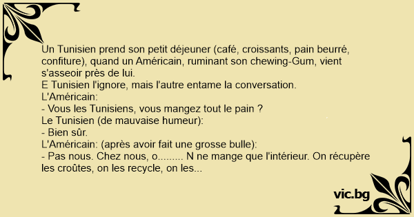 Един французин кротко си закусвал в хотела с кроасани, конфитюр, масло, сокче. До него седнал един американец, който нагло мляскал дъвка. Поседял американеца, позяпал в чинията на французина и попитал: