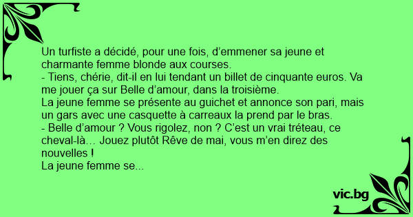 - Tiens, chérie, dit-il en lui tendant un billet de cinquante euros. Va me jouer ça sur Belle d’amour, dans la troisième.