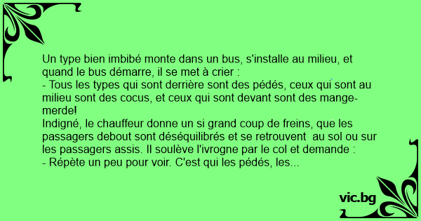 Indigné, le chauffeur donne un si grand coup de freins, que les passagers debout sont déséquilibrés et se retrouvent au sol ou sur les passagers assis. Il soulève l'ivrogne par le col et demande :