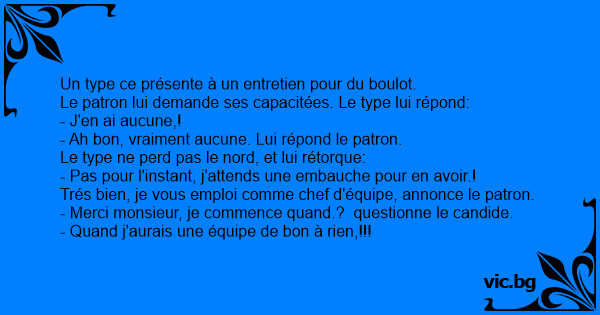 Trés bien, je vous emploi comme chef d'équipe, annonce le patron.