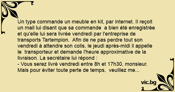 Un type commande un meuble en kit, par internet. Il reçoit un mail lui disant que sa commande a bien été enregistrée et qu'elle lui sera livrée vendredi par l'entreprise de transports Tartempion. Afin de ne pas perdre tout son vendredi à attendre son colis, le jeudi après-midi il appelle le transporteur et demande l'heure approximative de la livraison. La secrétaire lui répond :