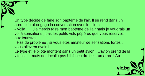 Le type et le pilote montent dans un petit avion . L'avion prend de la vitesse.... mais ne décolle pas ! Il fonce droit sur un arbre ! Au dernier moment , le pilote tire sur le manche et l'avion décolle en frôlant les branches de l'arbre ......