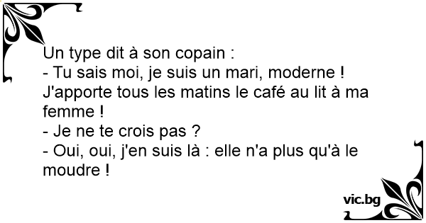 - Tu sais moi, je suis un mari, moderne ! J'apporte tous les matins le café au lit à ma femme !