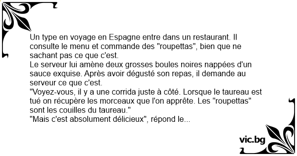Turysta odwiedził restaurację w Madrycie, spośród dań wybrał potrawę o nazwie "Jaja a la corrida". Danie było naprawdę duże i pyszne, a cena przystępna. Powtarzał tak kilka dni, aż pewnego razu,...