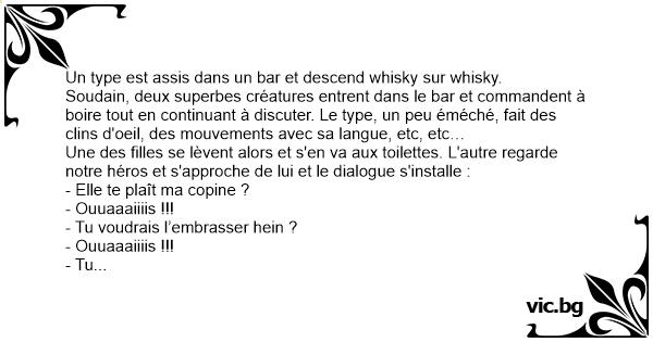 Soudain, deux superbes créatures entrent dans le bar et commandent à boire tout en continuant à discuter. Le type, un peu éméché, fait des clins d'oeil, des mouvements avec sa langue, etc, etc…