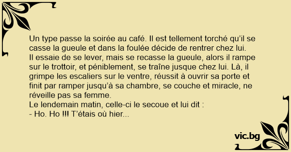 Un type passe la soirée au café. Il est tellement torché qu’il se casse la gueule et dans la foulée décide de rentrer chez lui.