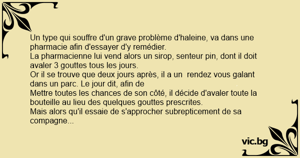 Un type qui souffre d'un grave problème d'haleine, va dans une pharmacie afin d'essayer d'y remédier.