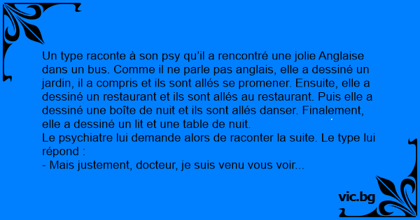 Un type raconte à son psy qu’il a rencontré une jolie Anglaise dans un bus. Comme il ne parle pas anglais, elle a dessiné un jardin, il a compris et ils sont allés se promener. Ensuite, elle a dessiné un restaurant et ils sont allés au restaurant. Puis elle a dessiné une boîte de nuit et ils sont allés danser. Finalement, elle a dessiné un lit et une table de nuit.