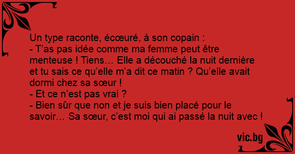 - T’as pas idée comme ma femme peut être menteuse ! Tiens… Elle a découché la nuit dernière et tu sais ce qu’elle m’a dit ce matin ? Qu’elle avait dormi chez sa sœur !