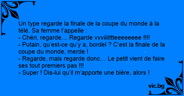 Un type regarde la finale de la coupe du monde à la télé. Sa femme l’appelle :