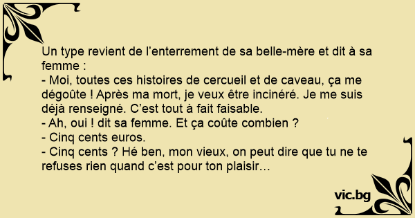 Un type revient de l’enterrement de sa belle-mère et dit à sa femme :